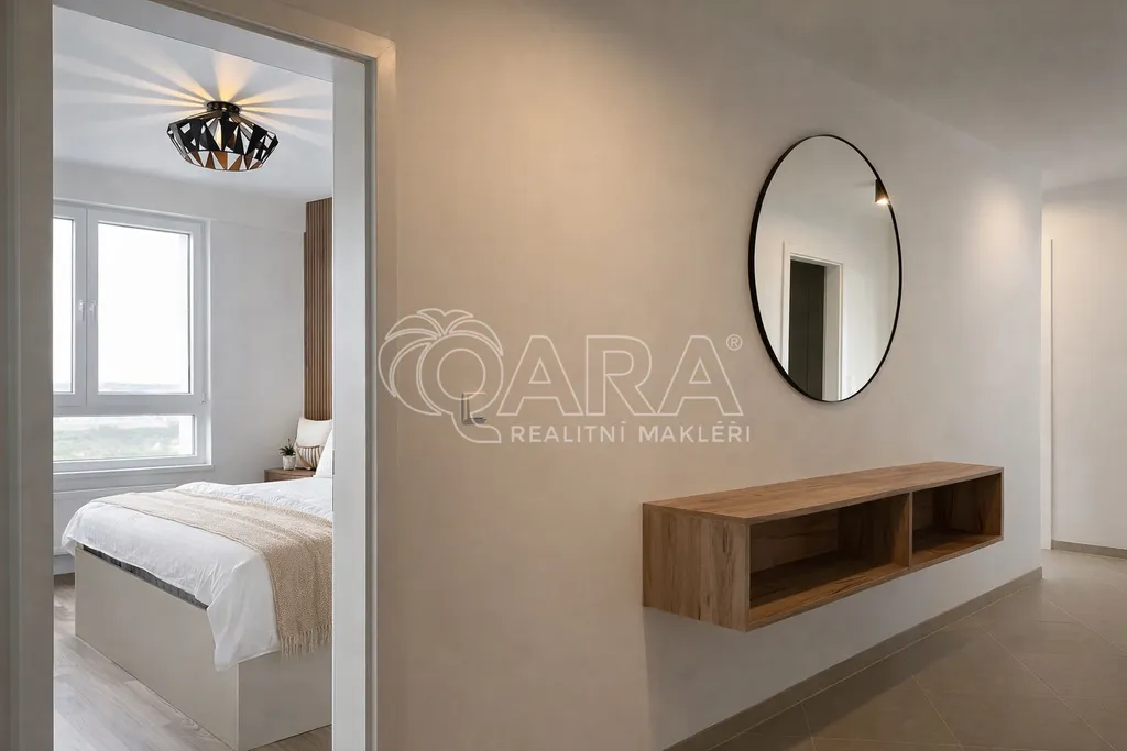Interiér bytu je zařízen v moderním stylu s důrazem na kvalitu a praktičnost. K dispozici je plně vybavená kuchyňská linka se všemi spotřebiči, vestavné skříně poskytující dostatek úložného prostoru a nábytek na míru v obývacím pokoji. Ložnice je doplněna o pracovní kout, což ocení zejména zájemci pracující z domova. Velkým benefitem je komora přímo v bytě a další úložný prostor ve formě komory na patře.