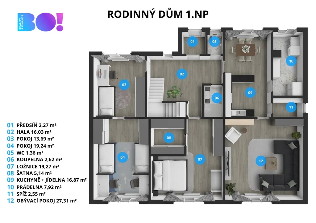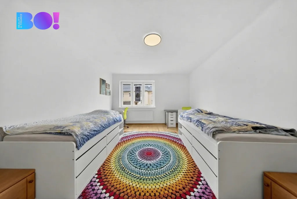 Navazuje na ni kuchyň s jídelnou a obývací pokoj. Praktickým bonusem jsou dvě komory – ideální na vše, co chcete mít po ruce, ale ne na očích. Dále samostatné WC, koupelna, ložnice s uzavíratelnou šatnou a dva dětské pokoje.