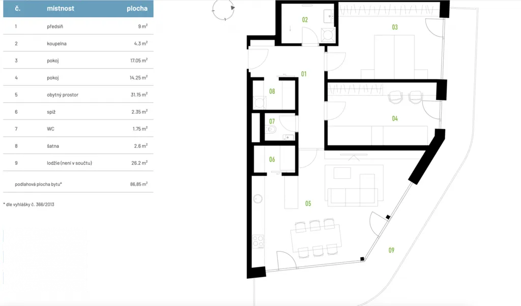 Nabízíme k pronájmu luxusní byt o dispozici 3+kk o celkové podlahové ploše 86,8 m and sup2; s prostornou lodžií 26,2 m and sup2;, situovaný ve 3. patře novostavby s výtahem v prestižní rezidenci Thera.