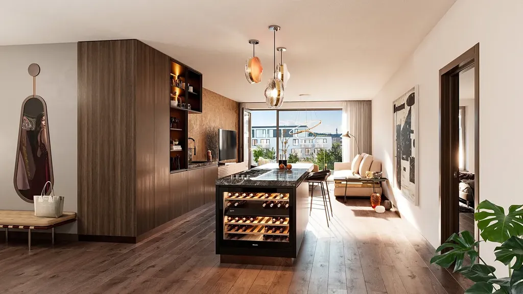 Byt vyniká moderním designem od renomovaného architektonického studia QARTA Architektura, které klade důraz na kvalitu, funkčnost a precizní detaily. Interiér je vybaven prémiovým standardem: klimatizací, dřevěnými celoplošně lepenými podlahami, podlahovým topením, bezfalcovými dveřmi s výškou 2,1 m, velkoformátovými hliníkovými okny s izolačním trojsklem a elektricky ovládanými předokenními screenovými roletami. K bezpečnosti přispívají vstupní dveře 3. bezpečnostní třídy. V koupelně najdete velkoformátové obklady a dlažby a podomítkové baterie. Na přání je možné vybavení bytu nebo jeho dispozici individuálně přizpůsobit v rámci klientských změn.