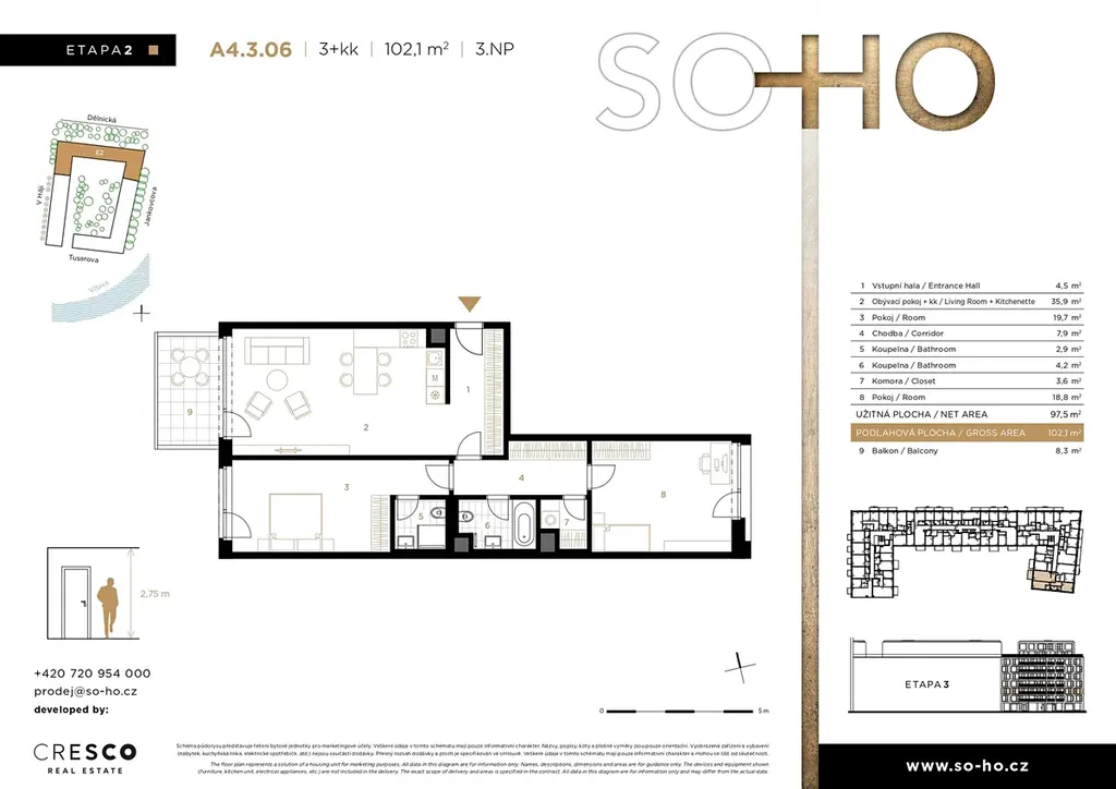 Atraktivní byt s klimatizací s dispozicí 3+kk (102,1 m²) s balkonem (8,3 m²) s orientací na západ do klidného vnitrobloku a na východ do ulice Jankovcova se nachází ve 3. nadzemním podlaží moderní novostavby 2. etapy v SO-HO Rezidenci v jižní části pražských Holešovic. Tento prostorově efektivně řešený byt nabízí otevřený, vzdušný obývací pokoj propojený s jídelnou, kuchyní, a navazujícím balkonem, což vytváří ideální zónu pro odpočinek i společenské aktivity. Vstupní hala a praktická průchozí chodba poskytují dostatek úložného prostoru. Ložnice je rovněž orientovaná do zeleného vnitrobloku a další pokoj naopak do ulice Jankovcova.
