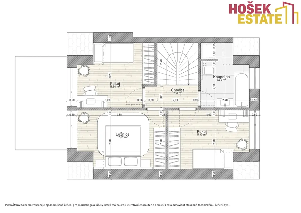 Dispozice 4+kk nabízí praktické a funkční uspořádání prostoru. Součástí domu je kvalitní vestavěný nábytek, který zajišťuje maximální využití prostoru a čistý, nadčasový vzhled interiéru.
