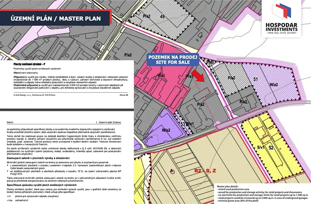 Dovoluji si Vám představit prodej lukrativního průmyslového / komerčního pozemku ve Znojmě při ulici Brněnská. Jde o pozemek o výměře 8.898 m2 s možností výstavby haly o velikosti 2.600 m2. Na pozemku je dnes nadzemní vedení vysokého napětí, na které je schválená přeložka a součástí kupní ceny je i provedení přeložky vedení do země při okraji pozemku tak, aby samotný pozemek byl minimálně zatížen viz přiložený zákres možné haly na pozemku. Pozemek je v lokalitě s dobrou dopravní dostupností jak do centra města tak do regionu. Nachází se v zavedené komerční zóně. Pro více informací mne prosím neváhejte kontaktovat.