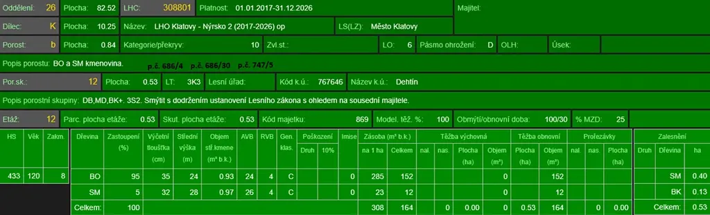 - p.č. 745 vedená jako lesní pozemek o celkové výměře 1 634 m2 (stáří lesa 91 let - zastoupení dřevin borovice, smrk),