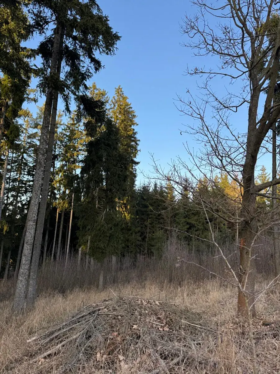 - p.č. 593/4 vedená jako lesní pozemek o celkové výměře 174 m2, z toho vlastníme podíl 1/4 tedy 44 m2 (stáří lesa 55 let - zastoupení dřevin smrk),