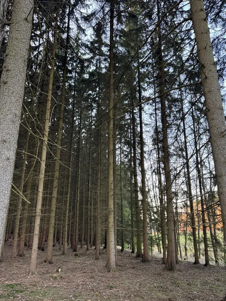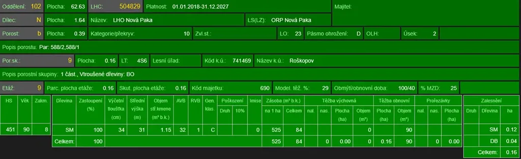 - p.č. 593/1 vedená jako lesní pozemek o celkové výměře 10 306 m2, z toho vlastníme podíl 1/4 tedy 2 577 m2 (stáří lesa 55 let a 41 let - zastoupení dřevin smrk),