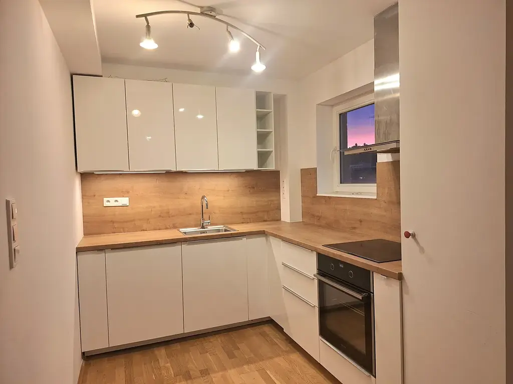V bytě je vstupní hala, dva neprůchozí pokoje, obývací pokoj s kuchyňským koutem. Pěkná rohová kuchyňská linka s vestavěnými spotřebiči. Spodní koupelna s WC, bidetem a sprchovým koutem. Elegantní schodiště do patra, kde je z chodbičky vstup do dvou prostorných neprůchozích ložnic a horní koupelna s WC a vanou.