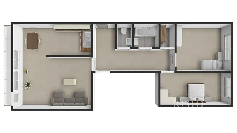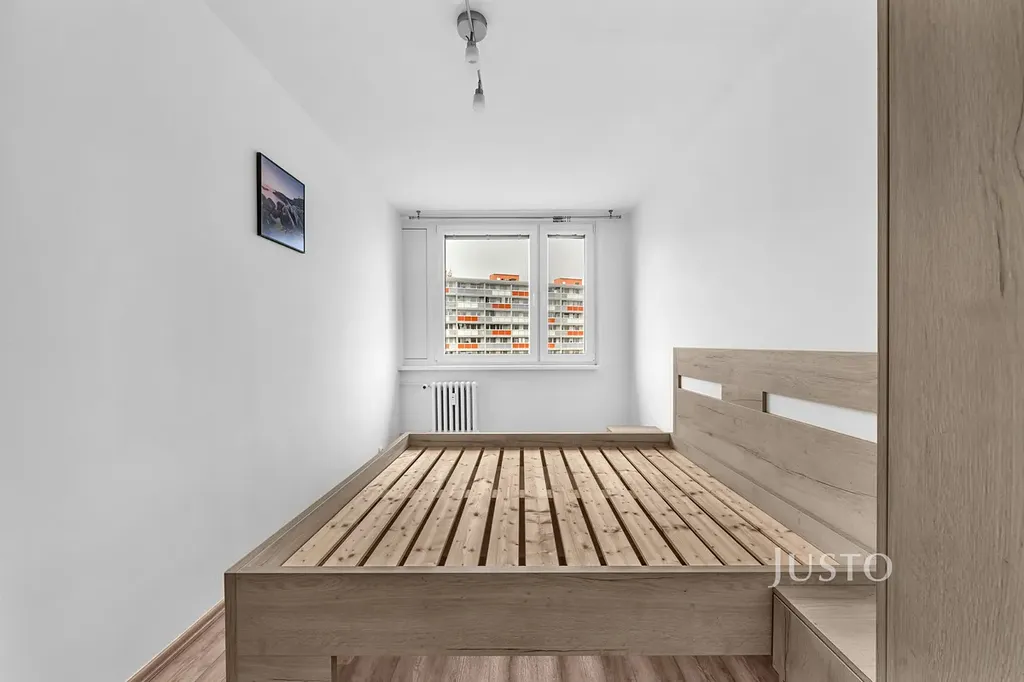 Dispozice bytu je vhodná zejména pro rodinu s dětmi. K dispozici jsou dva neprůchozí pokoje, které lze využít jako ložnici a dětský pokoj, případně pracovnu. V prostorném obývacím pokoji je místo na jídelní kout i odpočinkovou zónu a je propojen s moderní kuchyní na míru vybavenou myčkou, plynovou varnou deskou a elektrickou troubou. Kuchyňská linka v červeném designu nabízí dostatek úložného prostoru. V koupelně naleznete vanu, která je praktická jak pro děti, tak i pro relaxaci po náročném dni.