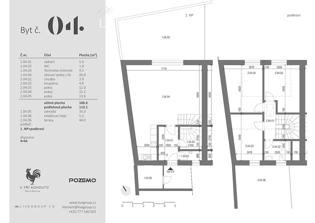 Projekt U tří kohoutů nabízí stylový byt č. 4 - 4+kk o ploše 113 m². Nachází se v centru Ivančic u Brna a nabízí moderní bydlení v příjemném prostředí. Největším benefitem je prostorný obytný prostor s kuchyňským koutem a přímým vstupem na sever orientovanou zahradu o velikosti 35 m², která poskytuje ideální místo k relaxaci a v 2.NP se nachází terasa o velikosti 44 m2.