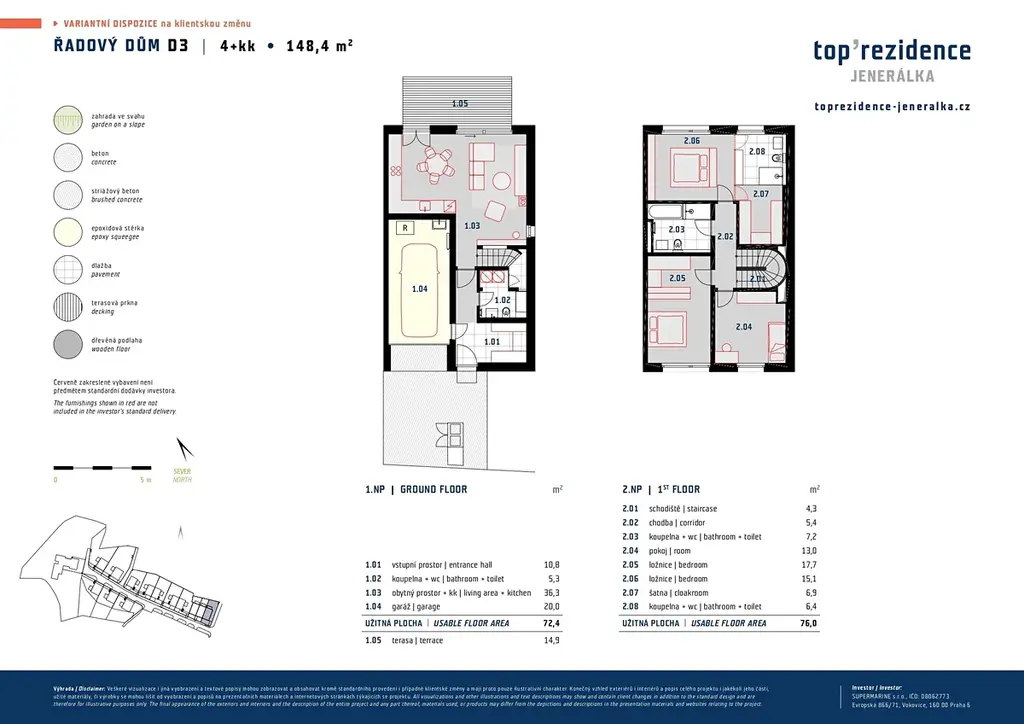 Dva pokoje ve 2.NP orientované na severovýchod do zahrady mohou být nahrazeny rodičovskou ložnicí s en-suit šatnou a koupelnou s celkovou výměrou téměř 30 m2.