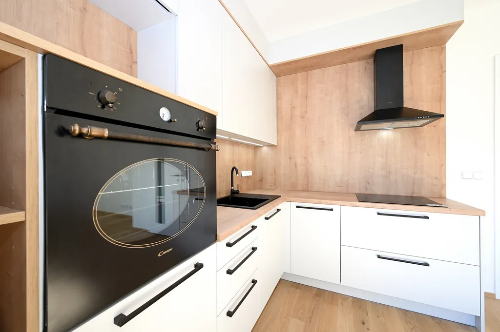 Kuchyňská linka je provedena v moderním designu v kombinaci světlých ploch a dekoru dřeva a je vybavena troubou, varnou deskou, digestoří a myčkou nádobí (součástí není lednice ani pračka).