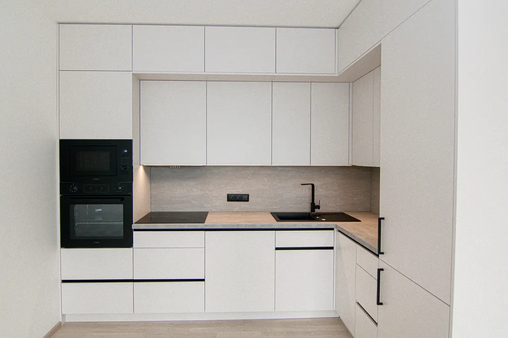 Kuchyňská linka do tvaru L je vyrobena na míru truhlářem a je plně vybavena vestavěnými spotřebiči– lednicí s mrazákem, myčkou, indukční varnou deskou, digestoří, elektrickou troubou a mikrovlnnou troubou.