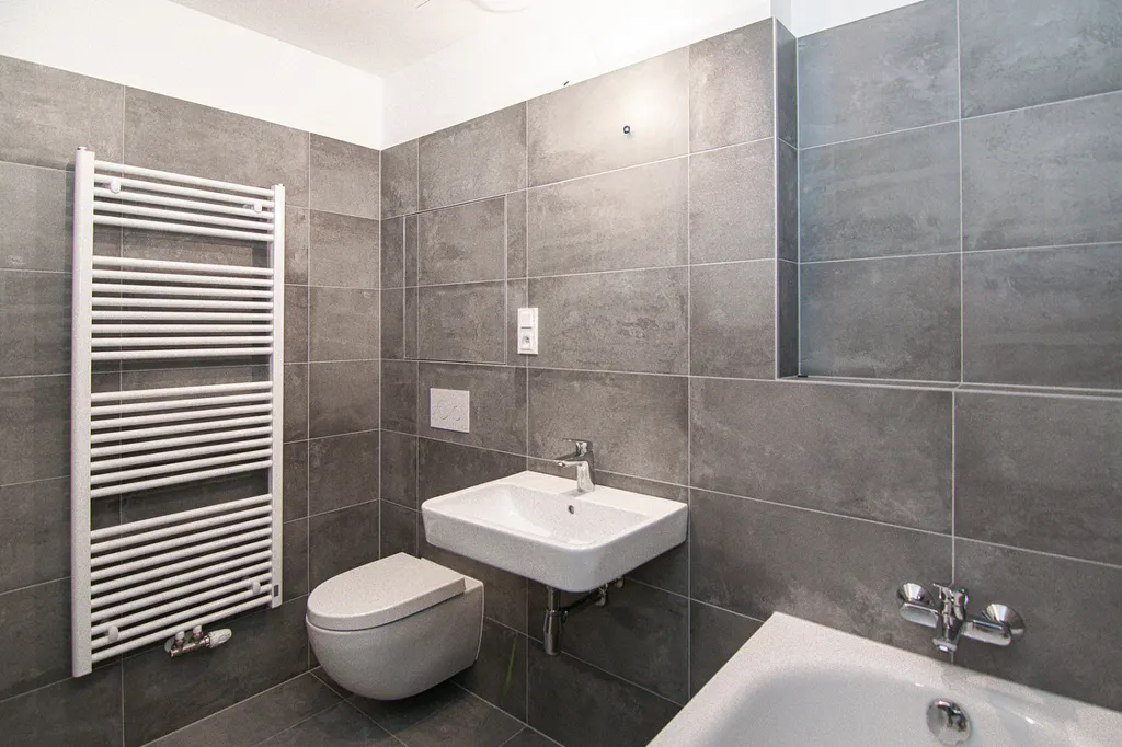 Koupelna je společná s toaletou a disponuje vanou, umyvadlem a galerkou se zrcadlem (právě se instaluje). Je zde dostatek místa pro pračku i sušičku.