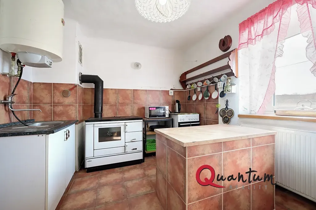 Dominantou domu je prostorný a světlý obývací pokoj s kvalitní dřevěnou podlahou a možností vytápění kamny na tuhá paliva. Na něj navazuje kuchyně s původními kamny na vaření, která dodávají prostoru jedinečný charakter, a prakticky řešenou kuchyňskou linkou. Další dva pokoje jsou průchozí, oba nadstandardně prostorné – jeden s dřevěnou podlahou, druhý s kobercem.