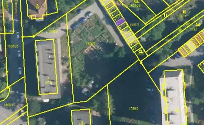 Garáž stojí na vlastním pozemku, který je také součástí prodeje, pozemek před garáží a příjezdová cesta je ve vlastnictví města Tišnov.