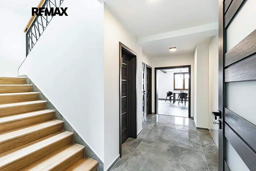 První nadzemní podlaží nabízí elegantní ložnici s vlastním balkonem, koupelnu se sprchovým koutem, samostatné WC a hlavní obytnou část propojenou se stylově řešenou kuchyní a jídelnou. Samozřejmostí jsou špičkové spotřebiče, vestavěná vinotéka a praktická spižírna.