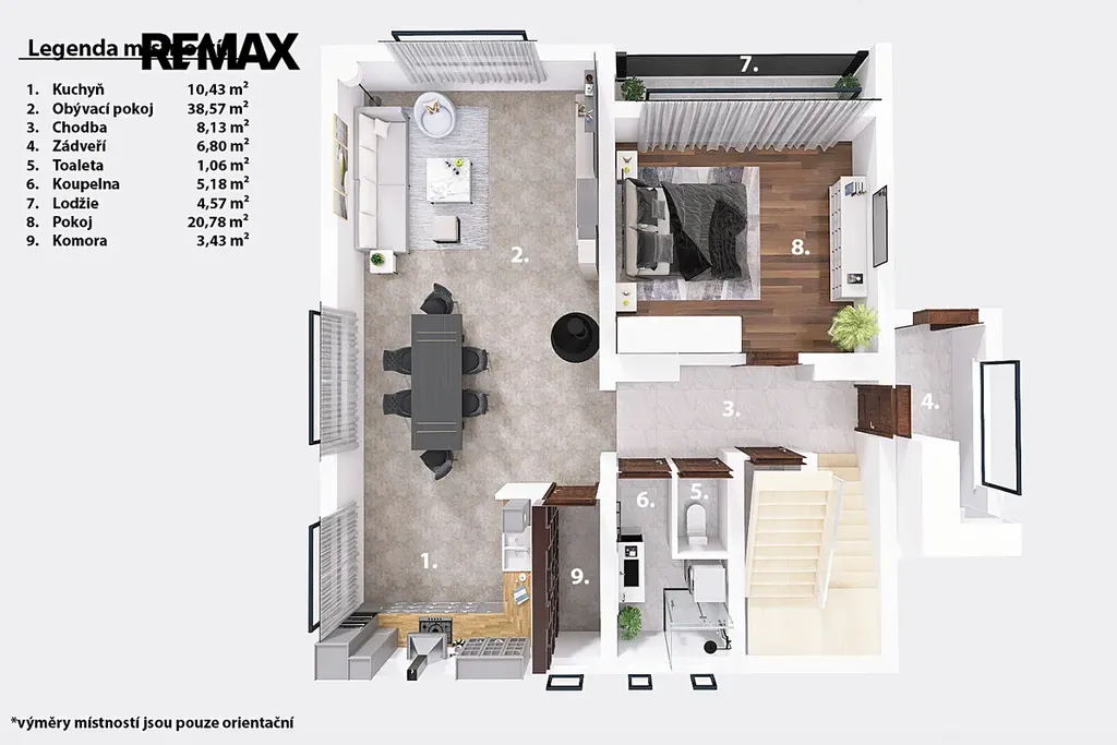 Orientační výměry jednotlivých místností jsou zmíněné v přiložených půdorysech. Spolu s tím Vám doporučujeme projít si nemovitost za pomoci 3D virtuální prohlídky, která Vám dopomůže k plné představě o rozložení jednotlivých místností.