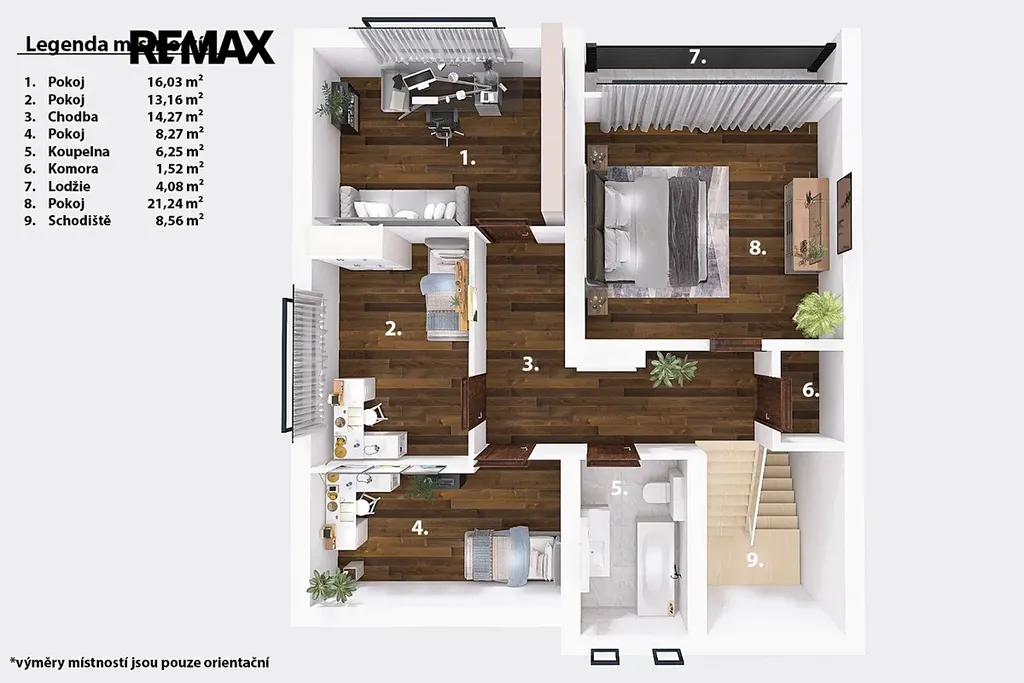 Orientační výměry jednotlivých místností jsou zmíněné v přiložených půdorysech. Spolu s tím Vám doporučujeme projít si nemovitost za pomoci 3D virtuální prohlídky, která Vám dopomůže k plné představě o rozložení jednotlivých místností.