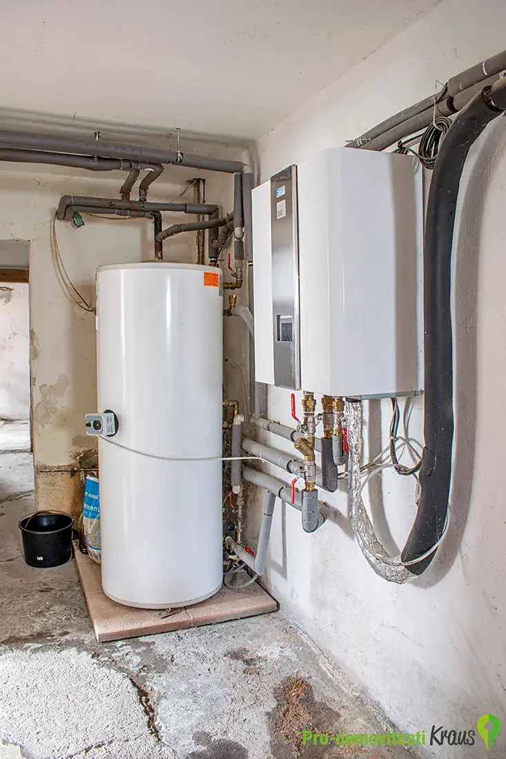 Dům je částečně podsklepený. Základy jsou smíšené, nadezdívka kamenná, zbytek stavby zděný z pálených cihel. Krov je v dobrém stavu, střešní krytina (pálené tašky) stará zhruba 15 let. Dům je napojený na městský vodovod, zároveň má k dispozici kopanou studnu rovněž napojenou do domu. Vytápění a ohřev vody zajišťuje buď tepelné čerpadlo se zásobníkem na teplou vodu nebo krb s výměníkem, vše napojeno do radiátorů. Náklady na provoz domu jsou překvapivě nízké. Plyn není do domu zaveden, ale v případě zájmu je v dosahu.