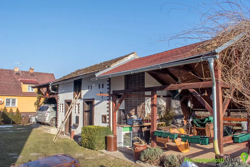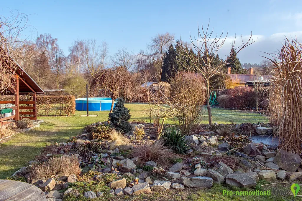 Na velké zahradě za domem orientované na jiho-východ stojí kryté stání na auto, kolna a pergola s krbem. Dále zde nalezneme okrasné stromy, záhony a skleník.