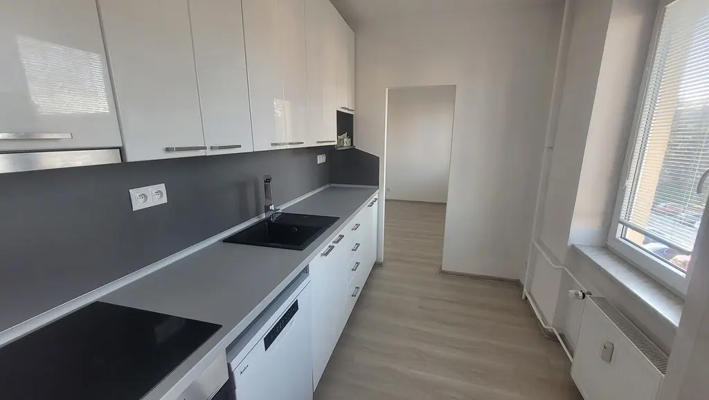 Byt se nachází ve třetím nadzemním podlaží bytového domu bez výtahu. Byt je po celkové rekonstrukci (voda, elektřina, kabelový datový rozvod, plovoucí podlahy, zděné jádro, sanitární technika, dveře, kuchyně). Vnitřní dispozice bytu: vstupní chodba, obývací pokoj s kuchyňským koutem, ložnice s balkonem a šatnou, malý pokoj, koupelna s vanou, samostatné WC. Kuchyňská linka je vybavena elektrickým sporákem, el. troubou a digestoří a vestavěnou myčkou. Byt je vytápěn ústředním topením s dálkovým rozvodem. Podlahová krytina jsou plovoucí podlahy nebo keramická dlažba. Byt má vlastní intercom a kabelové rozvody.
