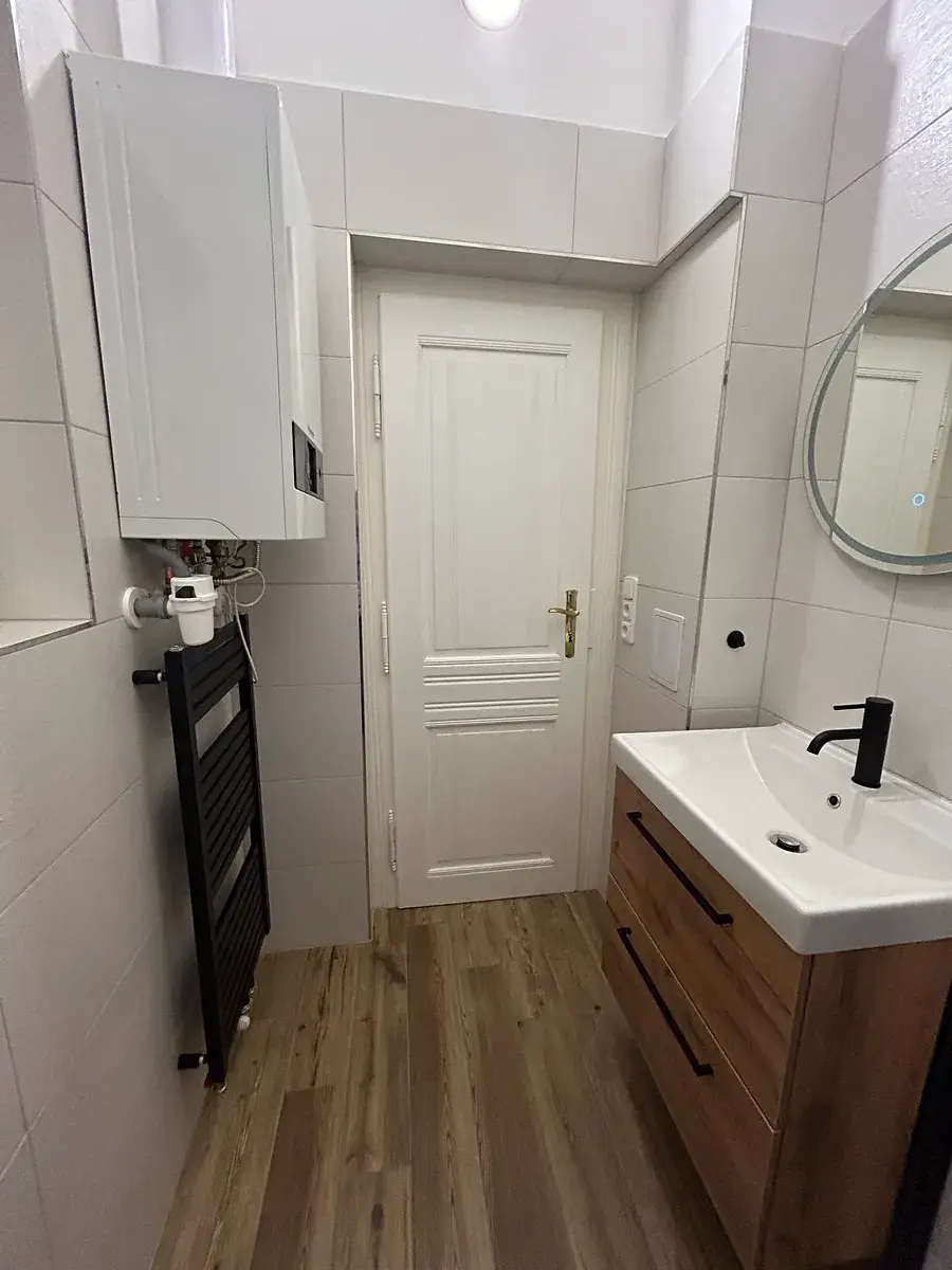 Nově zrekonstruovaná moderní koupelna se sprchovým koutem, skříňkou a zrcadlem. V koupelně instalován plynový kondenzační kotel Buderus, přívod na pračku a sušičku.