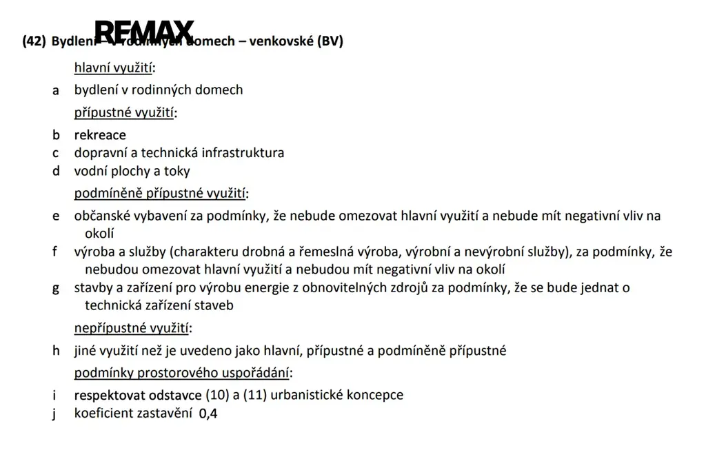Dle platného územního plánu obce je pozemek součástí zastavitelné plochy s funkčním využitím BV – bydlení venkovské, tedy plochy určené pro budoucí výstavbu rodinných domů. V tomto rozvojovém úseku je plánovaný vznik nových stavebních parcel, přičemž maximální zastavitelnost je stanovena na 40 % plochy každé parcely.