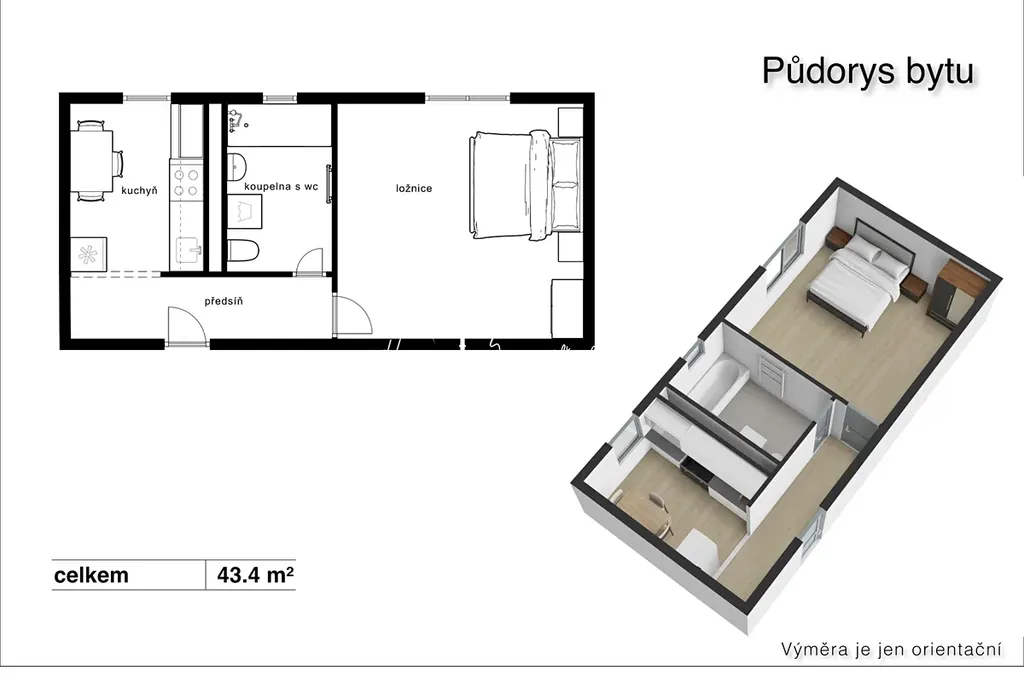 Byt se nachází ve druhém patře bytového domu a má celkovou výměru 43,43 m². Dispozice zahrnuje samostatnou kuchyň, prostorný pokoj, koupelnu a předsíň. Okna jsou situována do zahrady na jižní stranu. Byt je vhodný jak k vlastnímu bydlení, tak i jako investice.