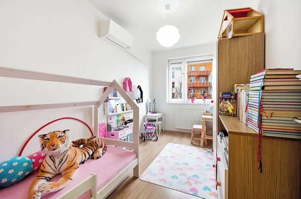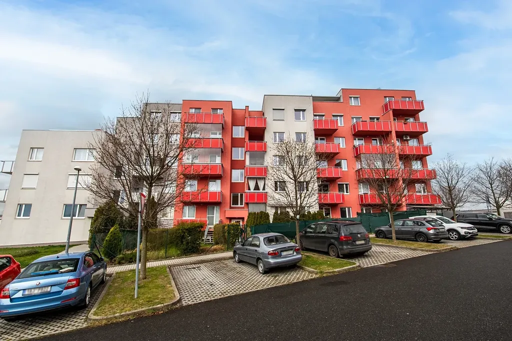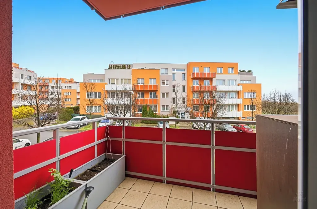 kuchyňským koutem, dvě samostatné ložnice, koupelnu a oddělené WC. Navíc každá místnost je klimatizovaná a okna bytu jsou opatřena před okenními stahovacími roletami. K bytu náleží lodžie a balkon o výměře 11.8m2, dále vnitřní parkovací místo a sklep (3.2m2)
