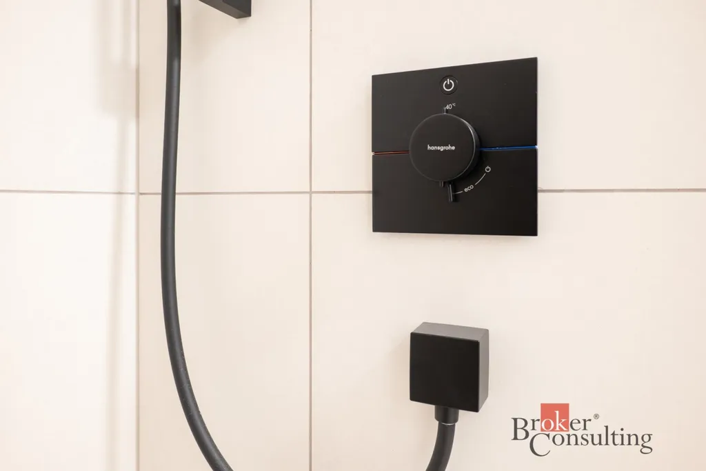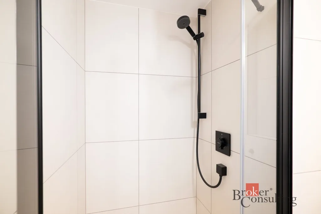 Koupelna: Moderní design se sprchovým koutem a toaletou.
