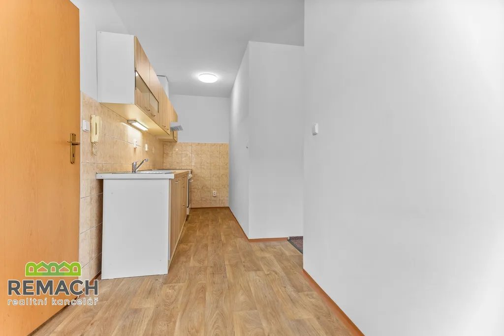 Do bytu se vchází přes vstupní chodbu, do jídelny s kuchyňskou linkou,