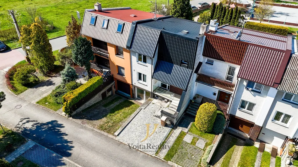 Dispozice domu je velmi prakticky řešená. V přízemí se nachází zádveří, samostatná toaleta a prostorný obývací pokoj s vybaveným kuchyňským koutem, krbovými kamny a vstupem na balkon. V patře jsou tři samostatné neprůchozí ložnice, koupelna s vanou i sprchovým koutem a další samostatná toaleta. Suterén nabízí další koupelnu, technickou místnost a příjemný prostor s posezením a přímým vstupem na zahradu. Možnost parkování na vlastním pozemku před domem.