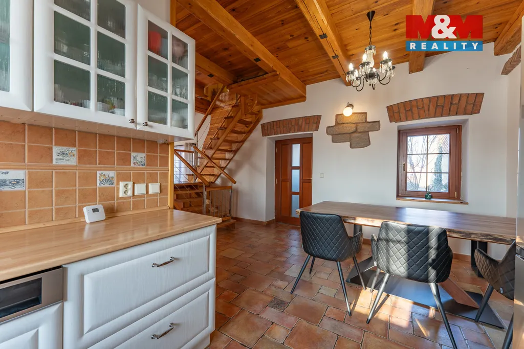 Rodinný dům z roku 2012 je promyšlený do posledního detailu a ideální pro pohodový rodinný život. V přízemí s podlahovým vytápěním naleznete plně vybavenou kuchyň s jídelnou, praktickou komoru, koupelnu s toaletou a světlý obývací pokoj s majestátným krbem. Interiér působí útulně díky kombinaci dřeva, bílé barvy a kamene.