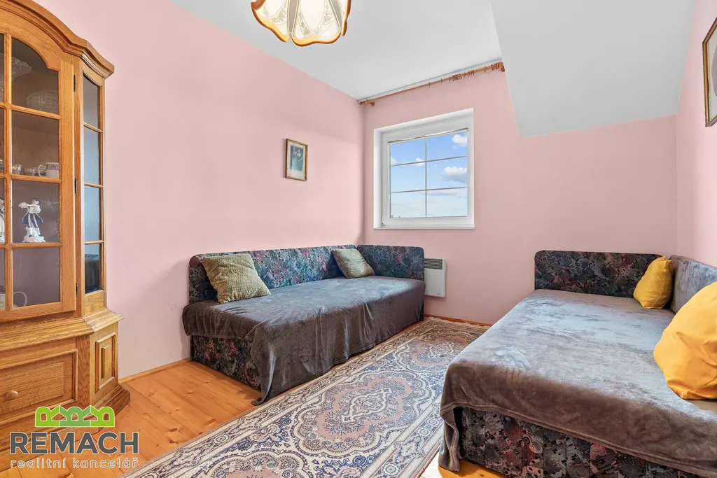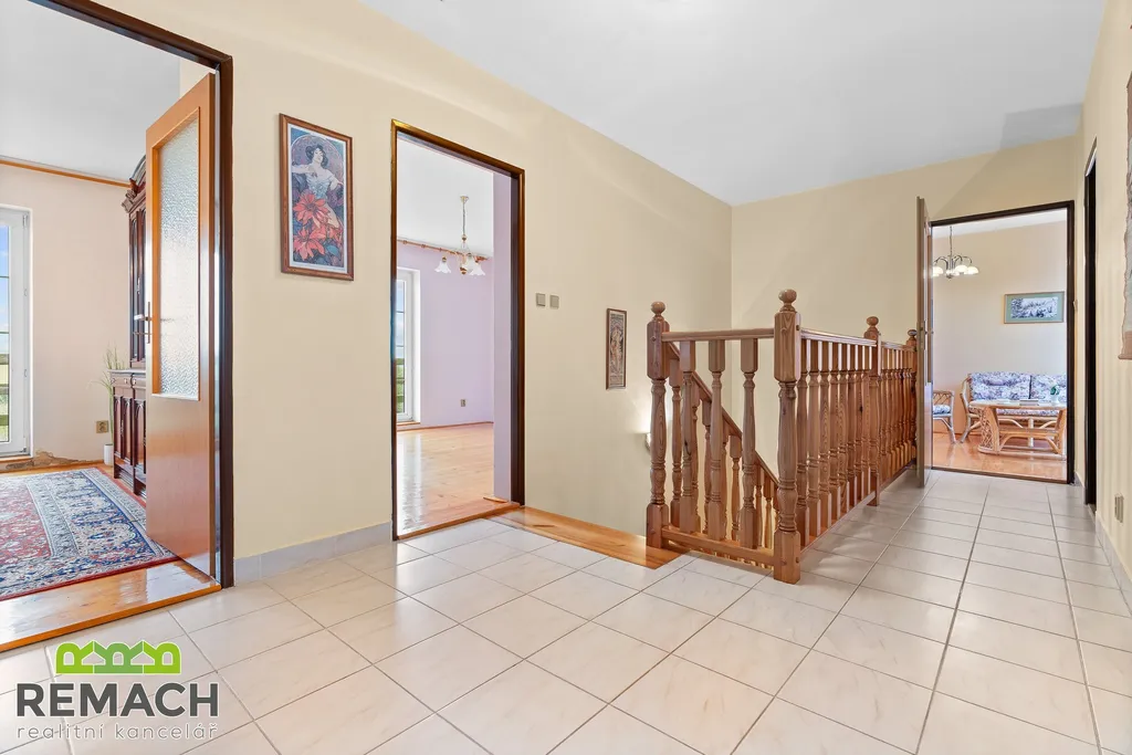V prvním patře jsou čtyři ložnice, ze dvou z nich je vstup na lodžii, kde máte opět výhled na zahradu a okolní krajinu.