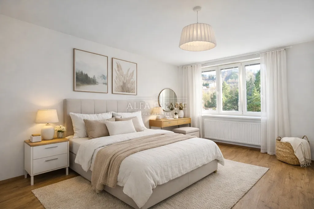 Dispozice bytu tvoří prostorná vstupní předsíň, dvě samostatné ložnice, elegantní koupelna a obývací pokoj s kuchyňským koutem. Výsledkem je interiér, který působí velmi příjemně, funkčně a zároveň reprezentativně. Byt je ideální volbou pro klienty, kteří hledají stylové, kvalitní a ihned obyvatelné bydlení v atraktivní části Karlových Varů.