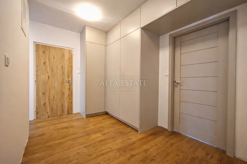 V rámci kompletní renovace byly provedeny zcela nové elektro rozvody, rozvody vody, nové štuky, snížené SDK podhledy, nivelační stěrky s kvalitní vinylovou krytinou a instalovány nové obložkové zárubně s interiérovými dveřmi značky Sapeli. Celý interiér působí nadčasově, harmonicky a velmi vkusně.