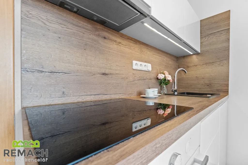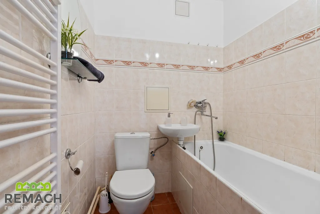 Cihlový, krásně zrekonstruovaný, byt o dispozici 1+1 o podlahové ploše 31 m², nacházející se ve druhém patře budovy, která je vzdálena jen kousek od centra Uherského Hradiště, přesněji 700 metrů chůzí na Masarykovo náměstí. V zádveří je šatní skříň a botník, dále vstup do koupelny s vanou, toaletou a topným žebříkem.