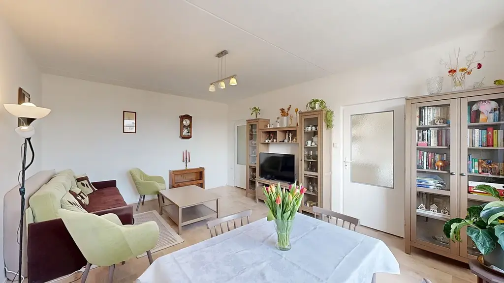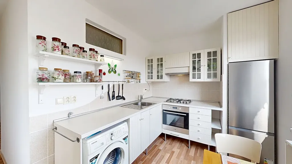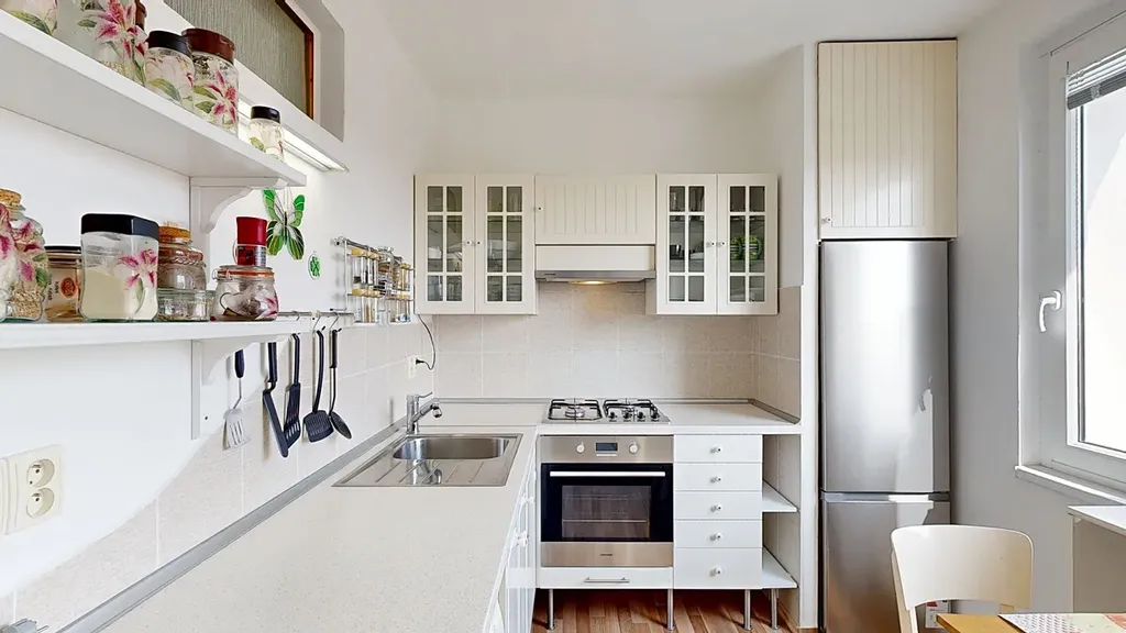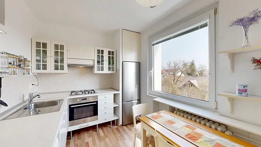 A teď k bytu: jedná se o byt 2+1 s vyzděným jádrem, novou kuchyní se spotřebiči (2011), v roce 2025 bylo položeno nové lino, osazeny nové bezpečnostní dveře, žaluzie a vyměněno těsnění oken. Přímo v bytě je velká komora a na ložnici navazuje zasklená lodžie. K bytu samozřejmě patří i sklepní koje.