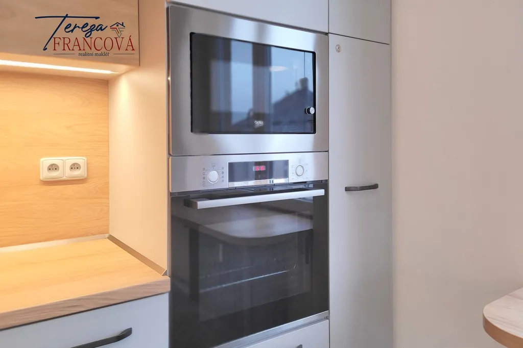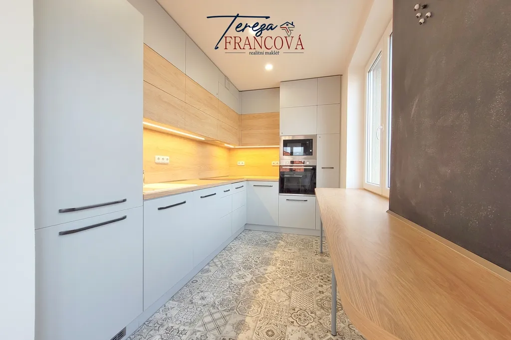 Kuchyně nabízí dostatek úložného prostoru a je vybavena moderní kuchyňskou linkou s vestavnými spotřebiči.