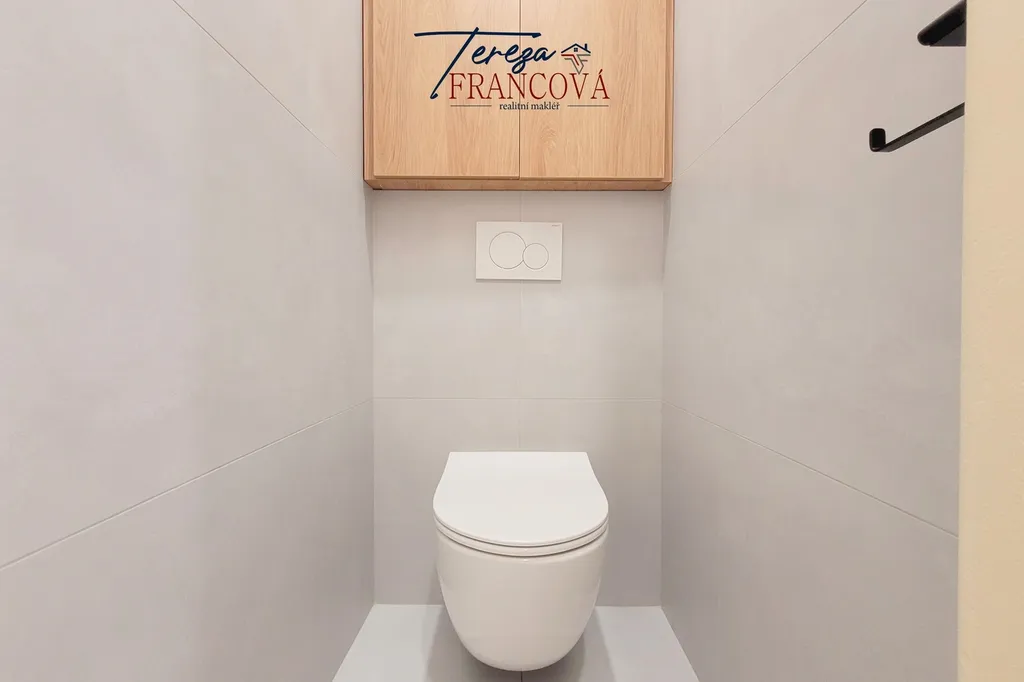 Koupelna byla navržena s důrazem na praktičnost a vzdušnost – sprchový kout se skleněnou zástěnou a chytrými úložnými prostory zajišťuje maximální komfort při každodenním užívání.