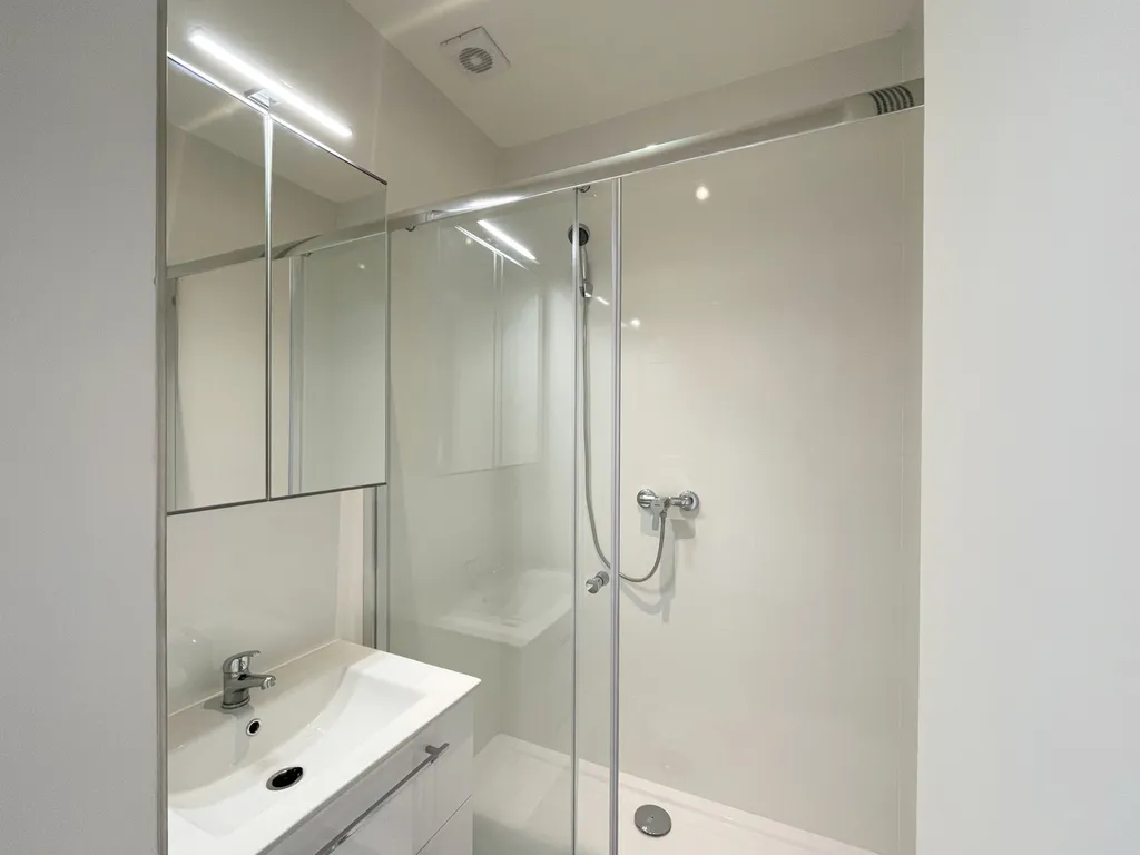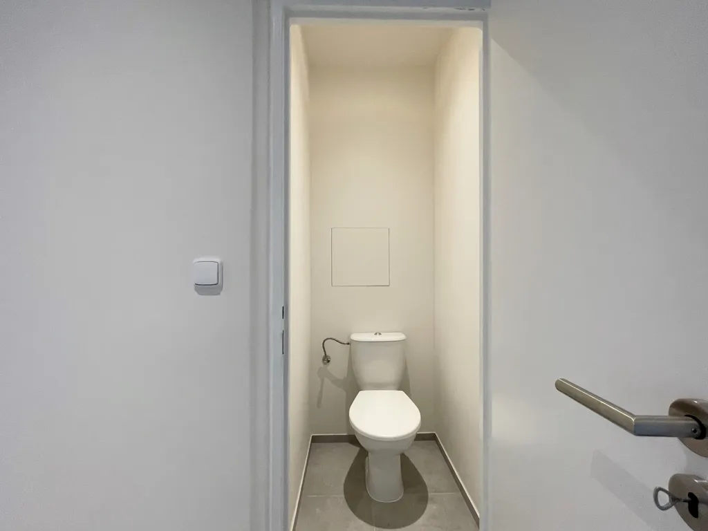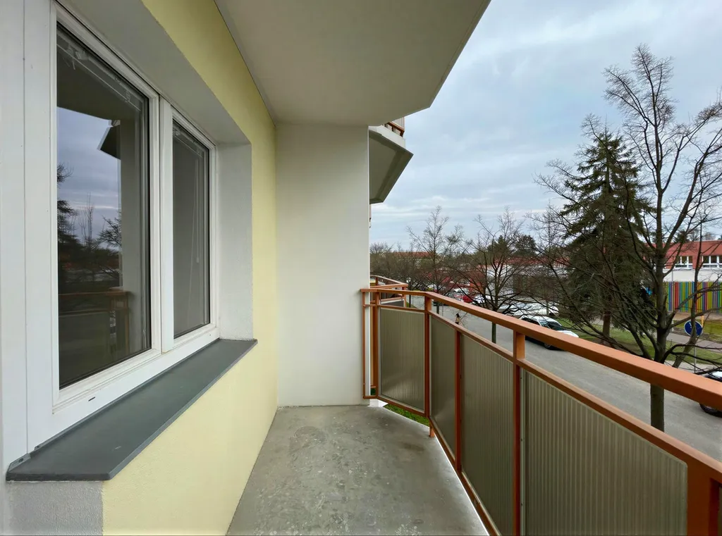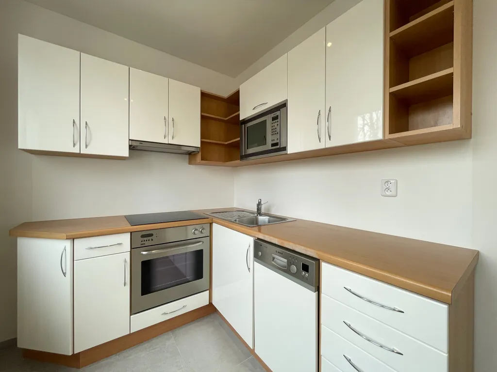 Kuchyně je vybavena spotřebiči – troubou, varnou deskou, digestoří, mikrovlnou troubou a myčkou nádobí. Nechybí ani prostor pro pračku a dostatek místa pro jídelní nebo barový stůl. Praktickým bonusem je omyvatelná stěna u kuchyňské linky. Dominantou jsou dva prostorné, neprůchozí pokoje – ložnice a obývací pokoj se vstupem na balkon. Všechna okna jsou orientována na jih, díky čemuž je byt krásně prosvětlený a působí velmi útulně a teple. Příjemným benefitem je balkon o ploše 4,6 m², který rozšiřuje obytný prostor a nabízí místo pro relax i drobné posezení. Koupelna disponuje sprchovým koutem, umyvadlem a moderními posuvnými dveřmi. Toaleta je samostatná. Byt dále nabízí prostornou vstupní chodbu s dostatkem místa na úložný prostor. K bytu náleží sklepní kóje v přízemí domu (o výměře cca 1,45 m²) a k dispozici je také společná kolárna. Dům má zadní vstup do klidného vnitrobloku se zelení. Lokalita