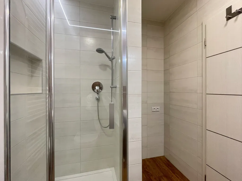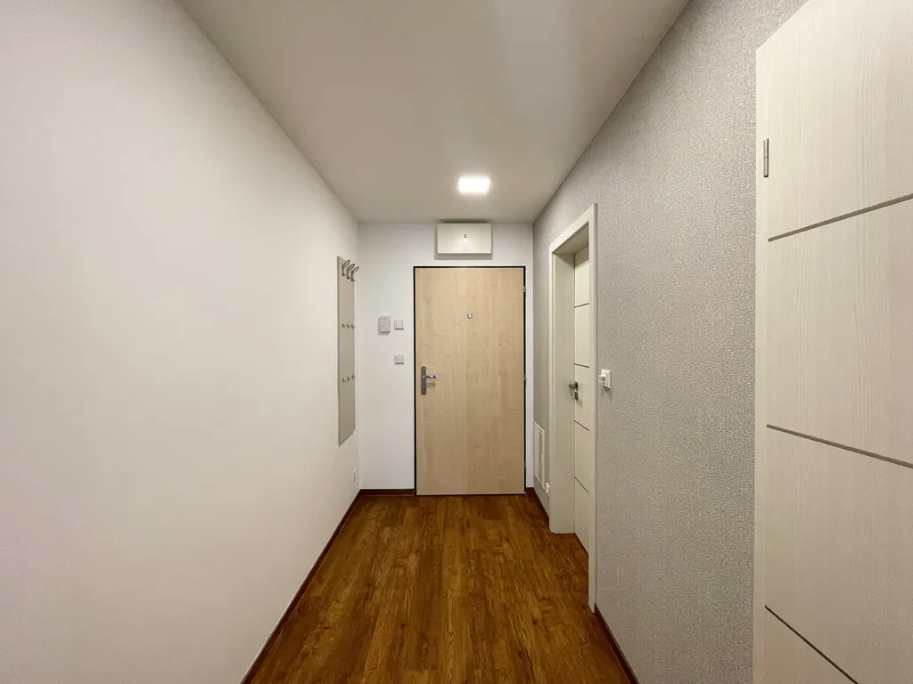 Byt je částečně vybavený. K dispozici je kuchyňská linka s lednicí, varnou deskou a mikrovlnnou troubou, dále konferenční stolek a obývací stěna. Hlavní obytný pokoj se vstupem na velkorysou terasu. Okno na terasu má rolety a záclony. Dispozice bytu nabízí prostornou chodbu, koupelnu se sprchovým koutem a prostorem pro pračku i sušičku . Velkou výhodou je také komora přímo v bytě, která poskytuje praktický úložný prostor. V domě je k dispozici také společná kolárna. Samozřejmostí je optické připojení Nordic pro rychlý internet.