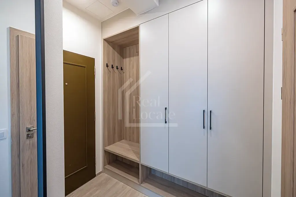 Byt je kompletně vybaven moderním nábytkem na míru, vyrobeným z materiálů nejvyšší kvality. Nabízí světlý obytný prostor, prostornou koupelnu s walk-in sprchou a množství úložných prostor. Celý interiér je navržen s důrazem na funkčnost a design.