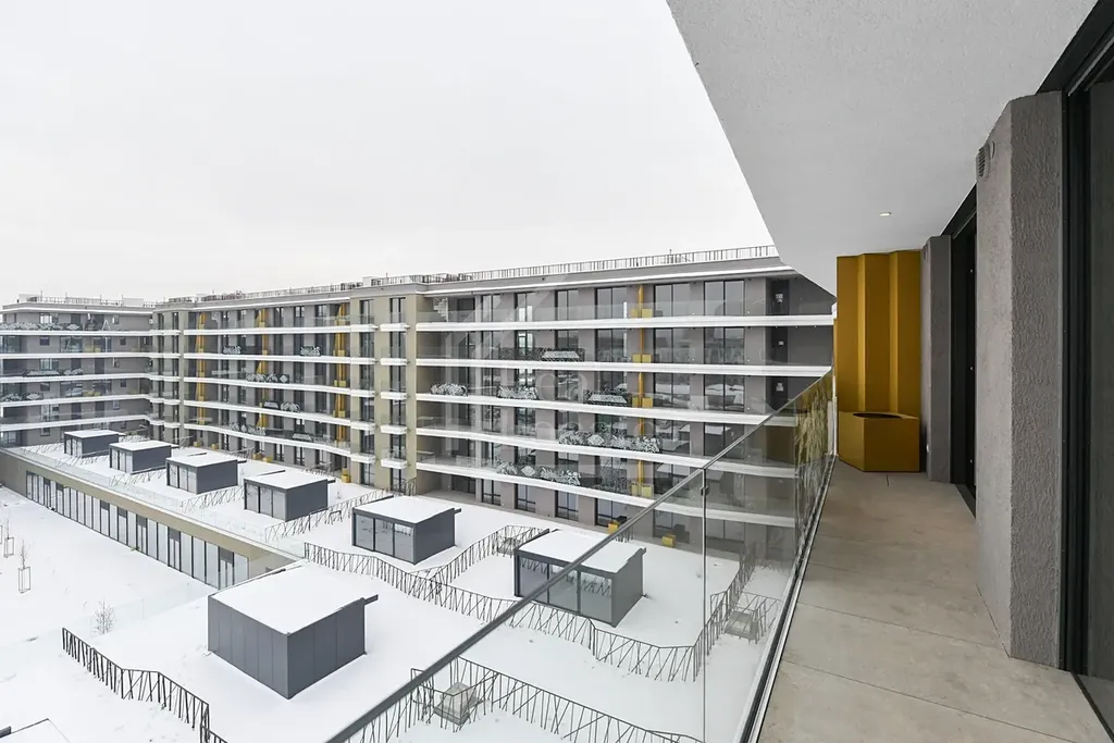 Byt se nachází v 6. patře bloku A a nabízí moderní bílou kuchyň, světlé podlahy a nadčasový design, který zdůrazňuje světlost a vzdušnost interiéru. Součástí bytu je také sklepní kóje a je zde možnost garážového stání. Byt se nachází bez parkovacího stání.