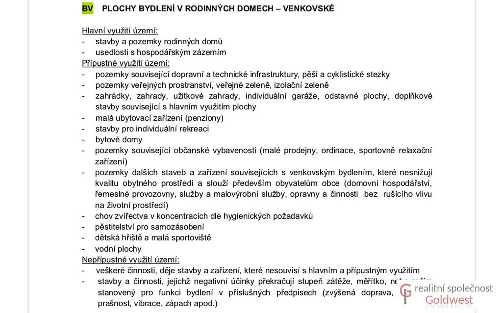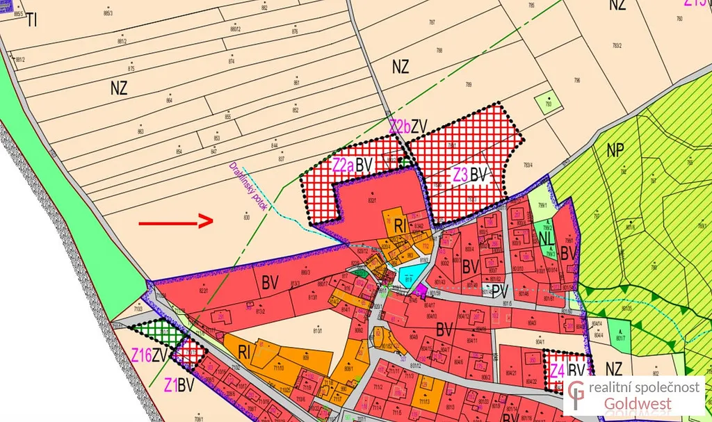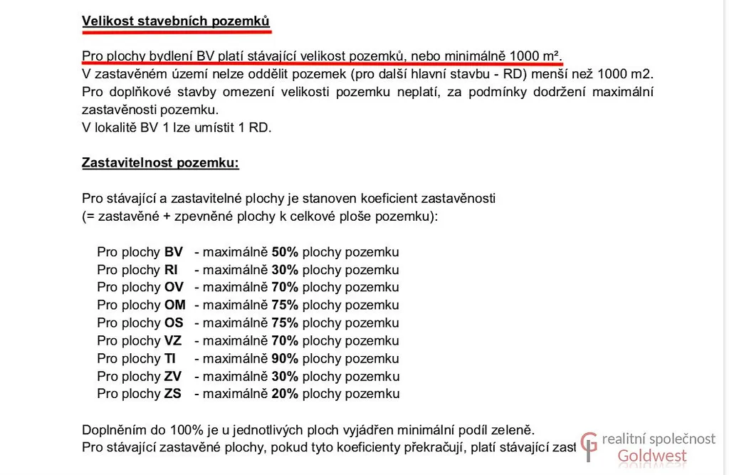 Dle územního plánu je pravá část o výměře cca. 4 900 m² určená k zástavbě a označená BV - plochy bydlení v rodinných domech - venkovské, kdy koeficient zastavění je 50%, velikost budoucích parcel 1000 m². Lze tedy rozdělit případně i na 3 samostatné stavební parcely.