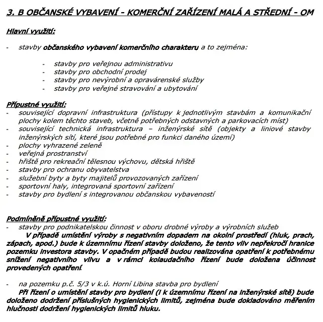 Hlavní využití pozemku dle ÚP je pro stavby občanského vybavení komerčního charakteru (stavby pro veřejnou administrativu, pro obchodní prodej, pro opravárenské služby....).