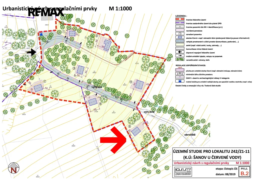 Na lokalitu je již vypracována územní studie, určuje zastavěnou plochu hlavní stavby 70 - 150m², koeficient zastavění je stanoven na 35%.