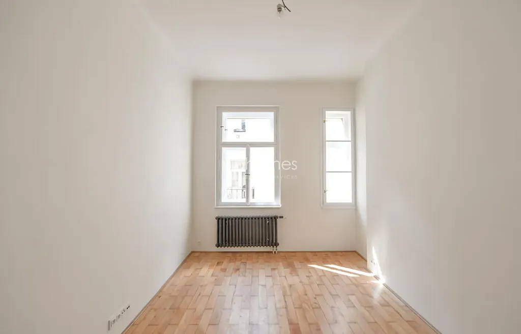 Celý dům je po celkové renovaci se zachovalými původními prvky. Byt tvoří obývací pokoj s plně vybavenou kuchyní, (indukční varná deska, trouba, myčka a mikrovlnná trouba, lednice s mrazákem), 2 samostatné ložnice orientované do klidného vnitrobloku, koupelna se sprchovým koutem (podlahové vytápění), formální vstupní hala. V interiéru byly vkusně zkombinovány moderní prvky se zachovanými původními architektonickými detaily.