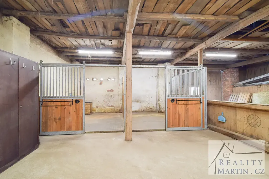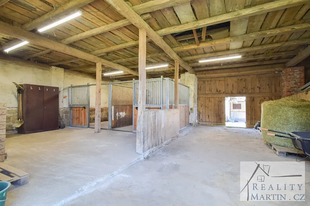 Stodola 84 m, 2 x box pro koně s gumovou podlahou 3,6m x 2,75m, kolna 23,5 m2, garáž 20 m2. Napájení koní v boxech řešeno vědry.
