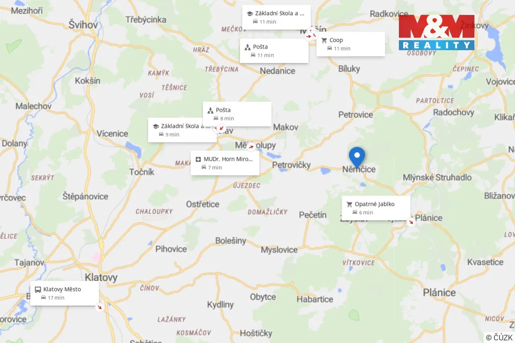 Lokalita je ideální pro ty, kteří hledají klidné bydlení v blízkosti přírody, přesto s dobrou dostupností služeb. Nepomuk, Klatovy, Plánice i Měčín jsou vzdáleny 6–15 minut jízdy. Ideální místo pro nový začátek na venkově.